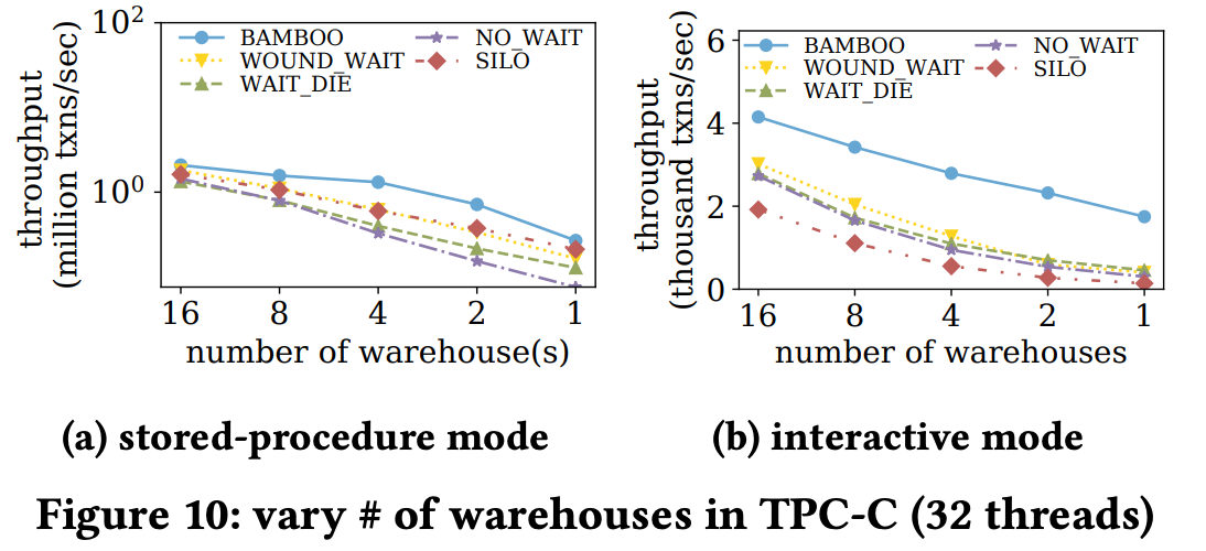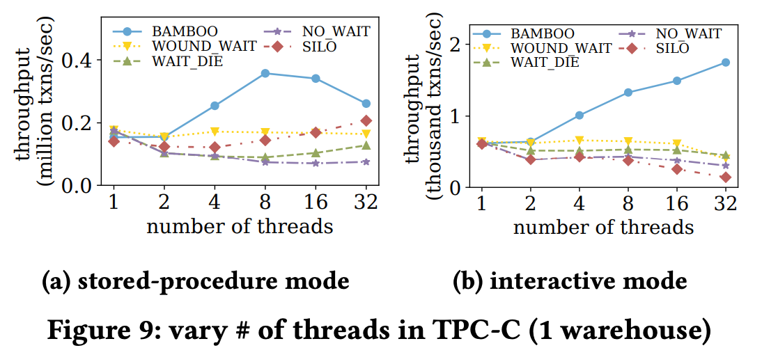 - Silo는 abort rate이 높아서 이 stored-procedure 모드에서는 bamboo 보다 빠름 (cache warm-up)