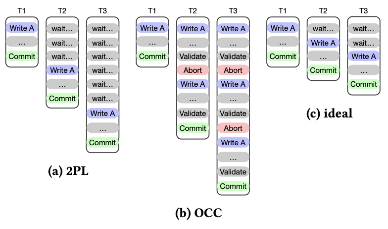 (b) OCC: 커밋 단계에서 충돌 감지(Validation) 후 abort
